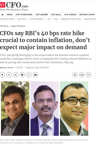 Topic: CFOs say RBI's 40 bps rate hike crucial to contain inflation, don't expect major impact on demand